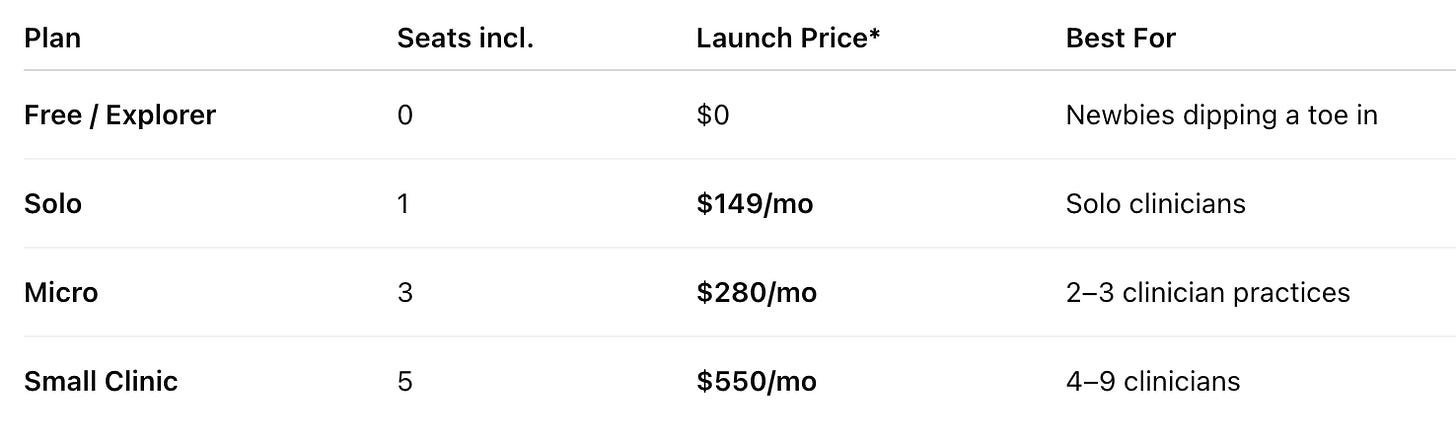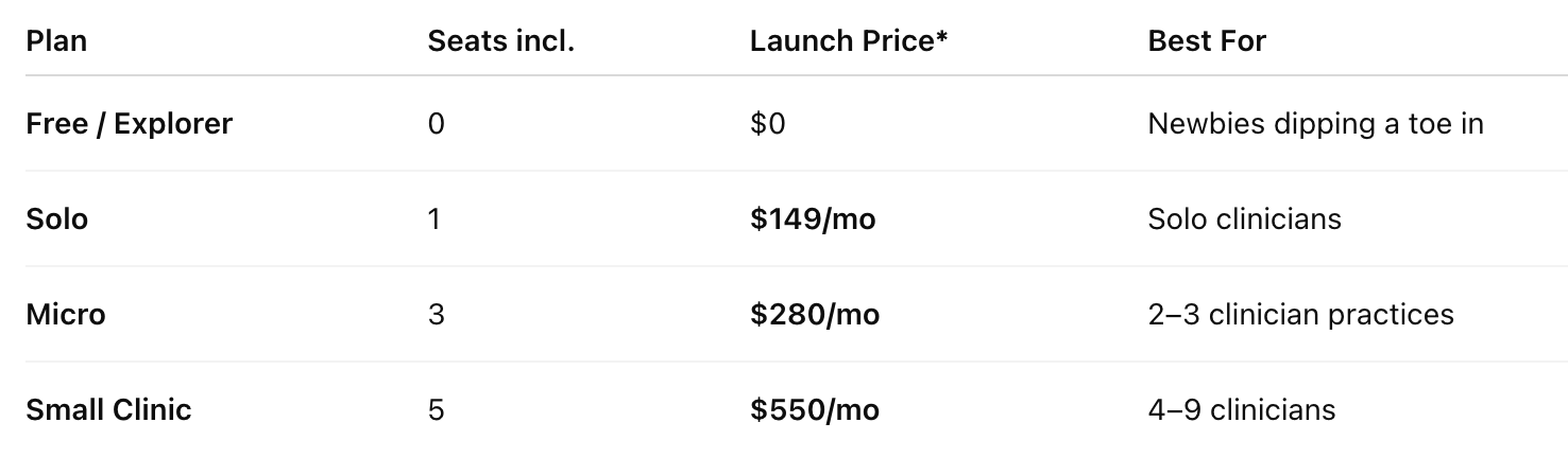 Pricing Refresh — Say hello to Solo, Micro, Small Clinic & Free/Explorer plans (see card below). Early adopters get ‑27 % off.